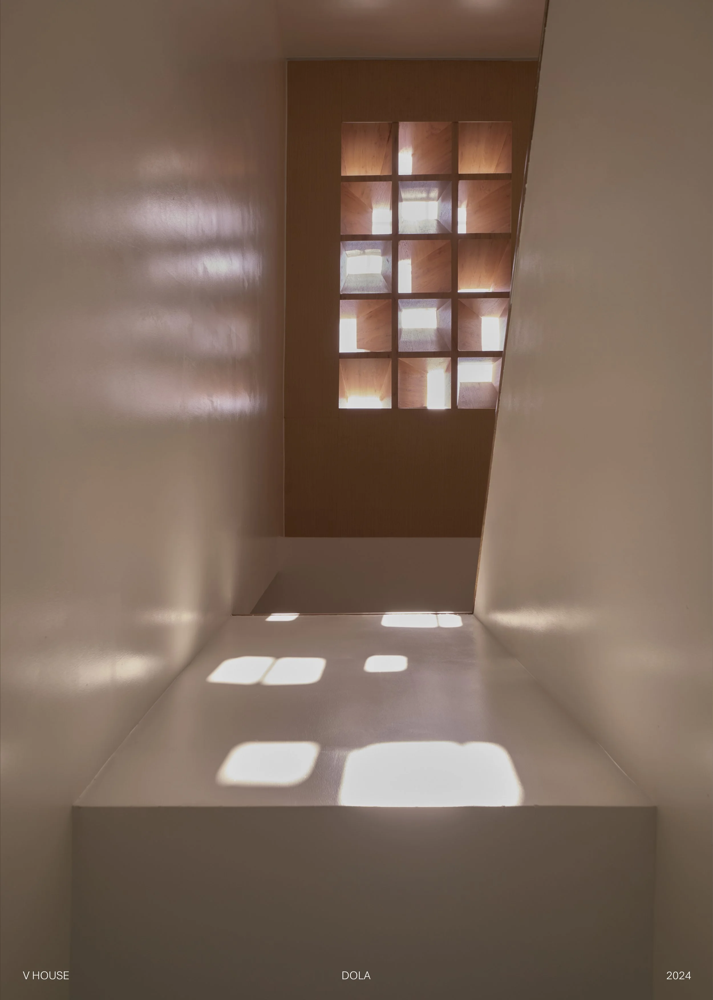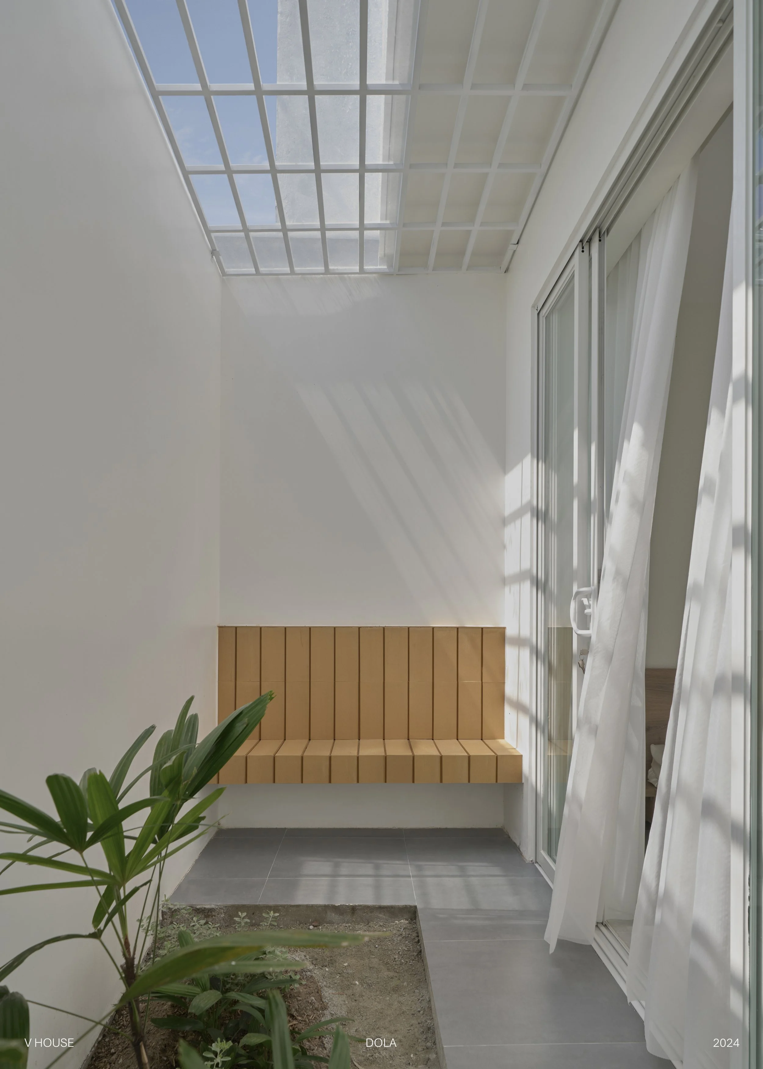 Cầu nối giữa 2 tầng là cầu thang ốp gỗ, bên trên là giếng trời với mái kính kết hợp hệ lam trang trí, để vừa lấy sáng vừa tạo hiệu ứng bóng nắng cho toàn bộ phần cầu thang.