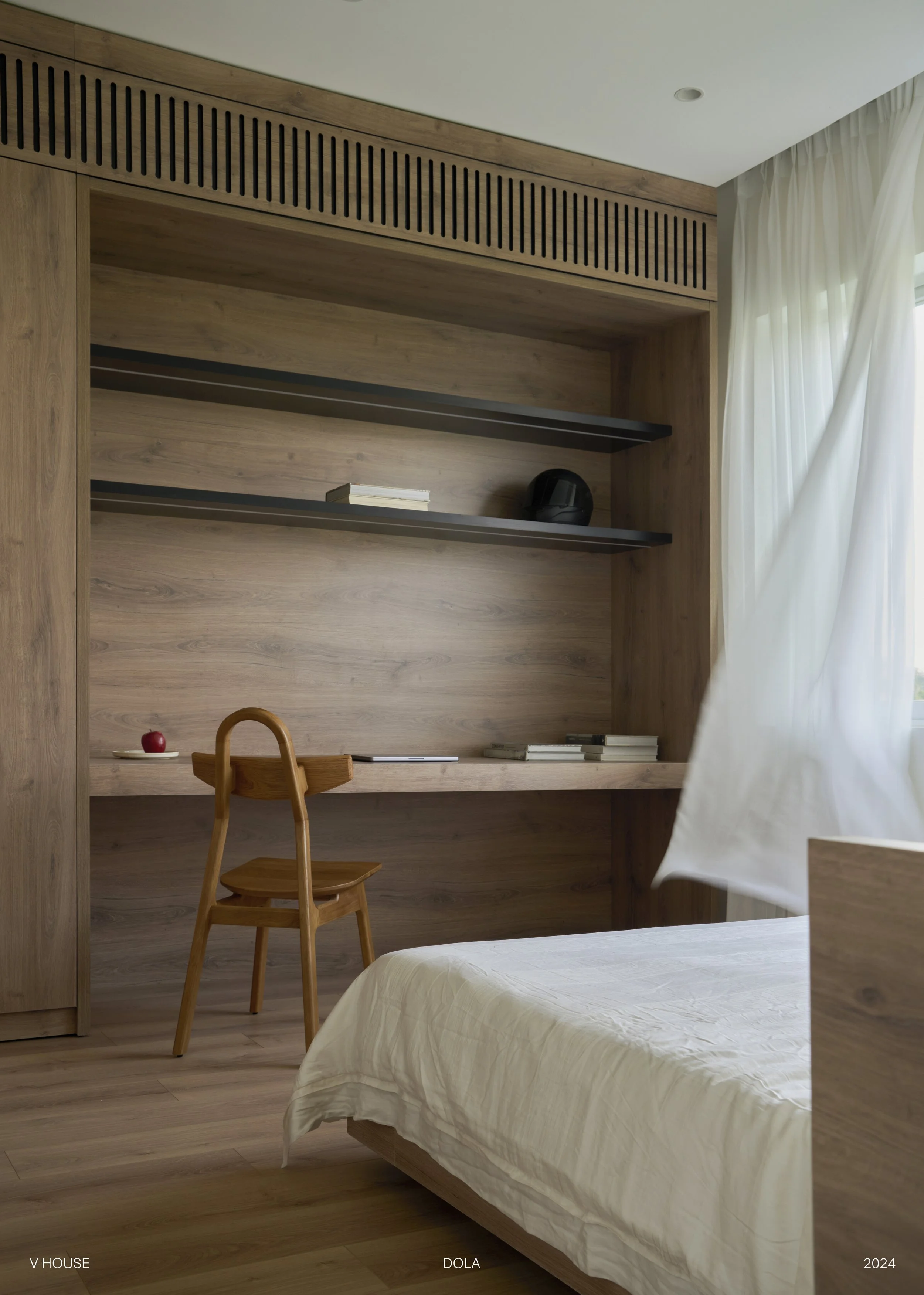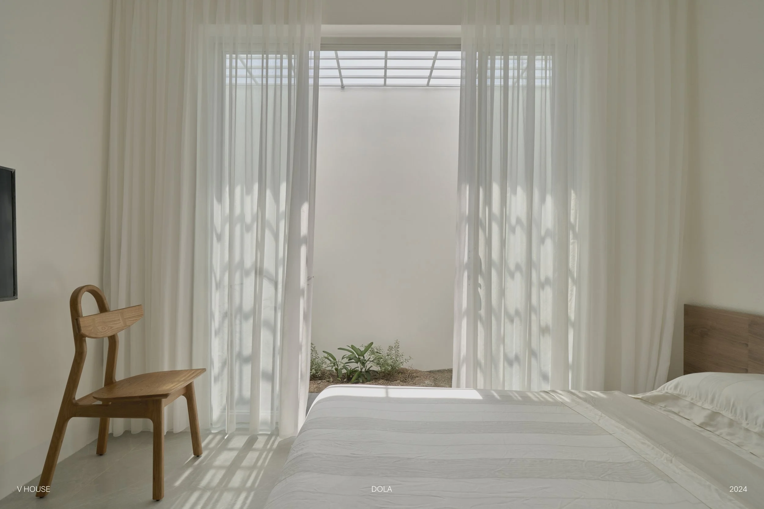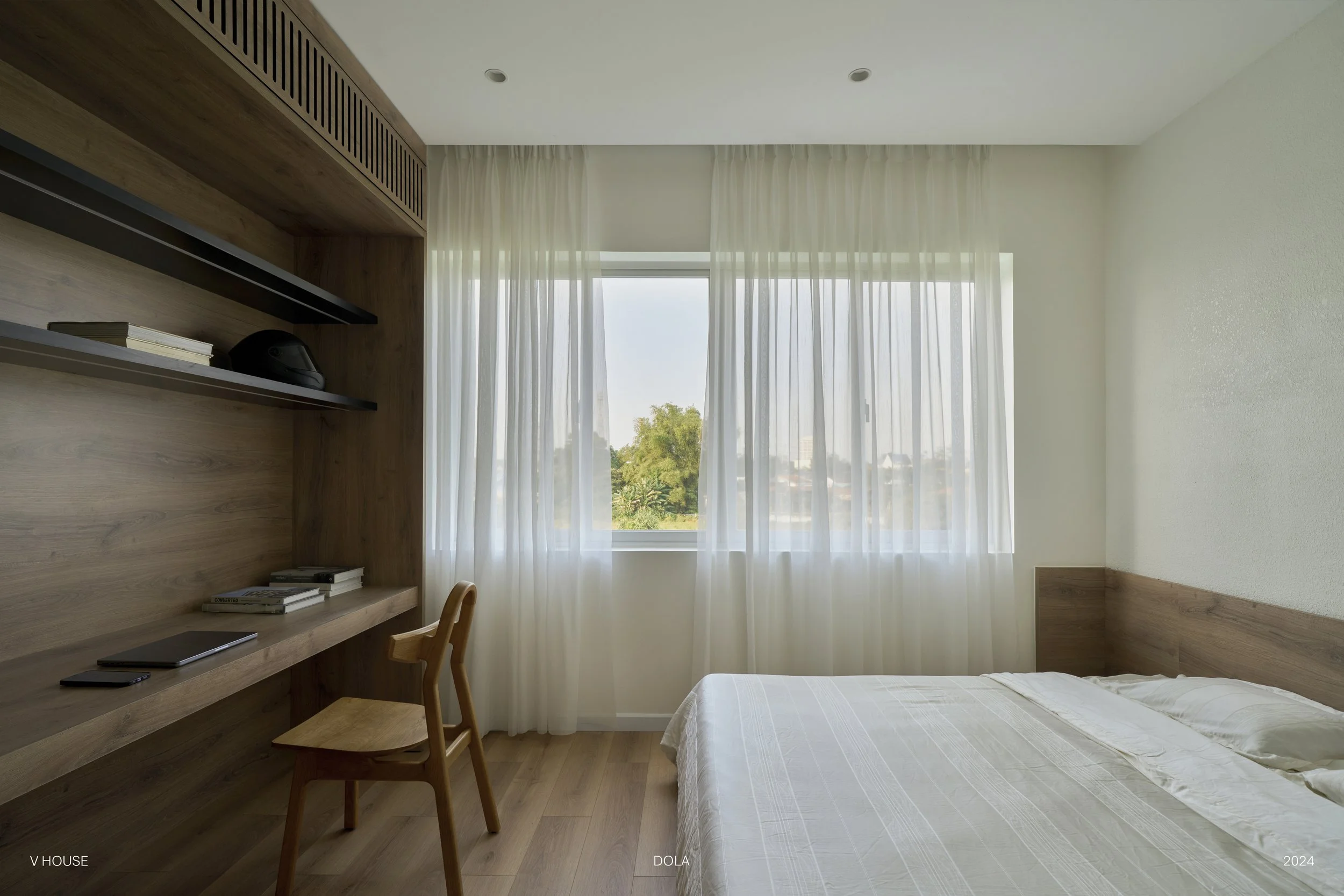 Với phòng ngủ này, chúng tôi không sử dụng quá nhiều vật liệu mà thay vào đó, chúng tôi chọn cách tối ưu ánh sáng tự nhiên và tạo mảng xanh cho không gian này để mang lại cảm giác thoải mái nhất.