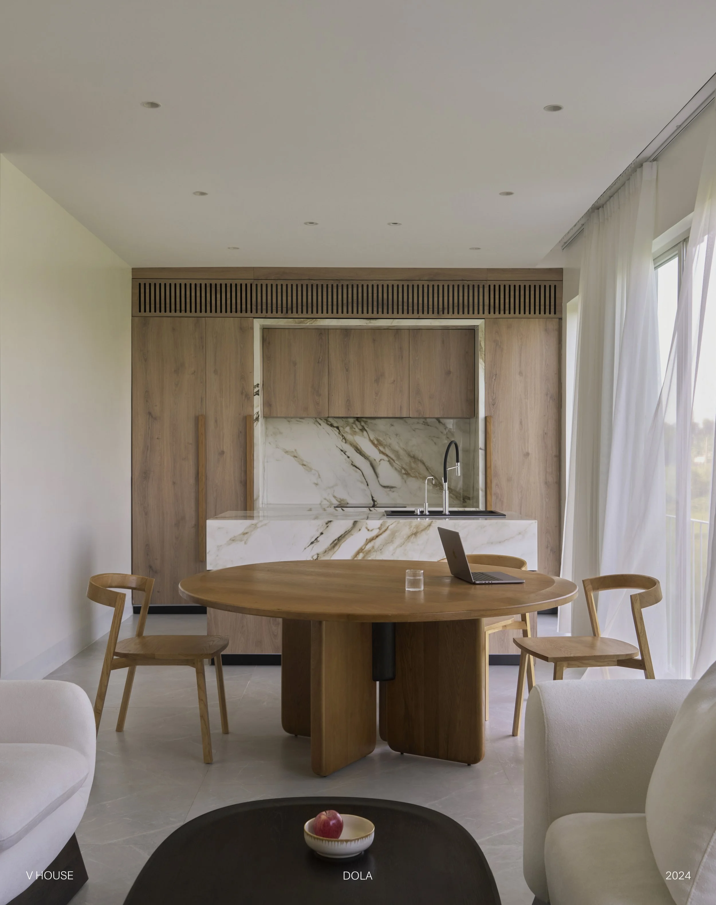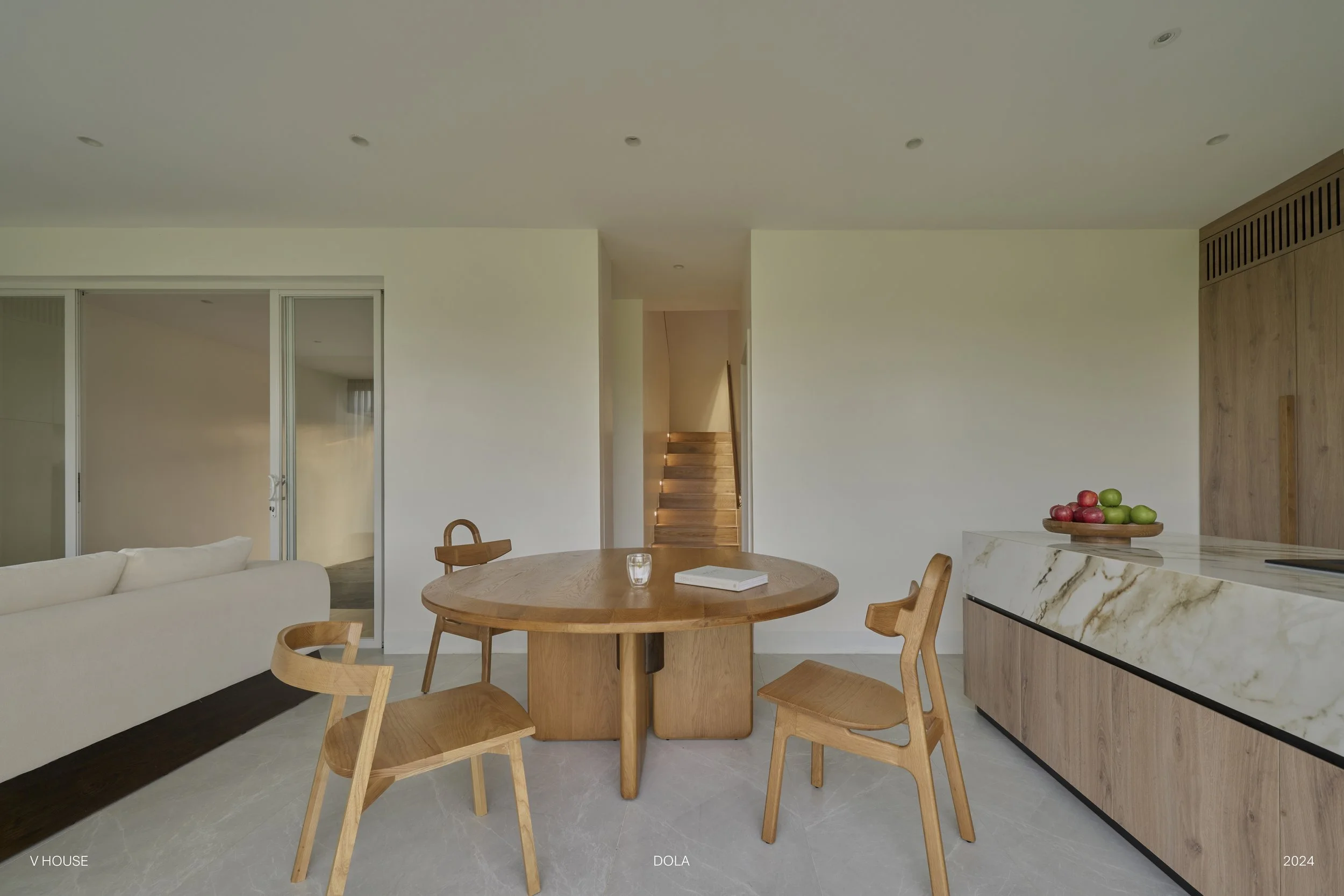 Bên cạnh đó, phòng khách cũng được bố trí kết hợp với phòng ăn và bếp mở để tối đa view nhìn ra hướng ruộng.